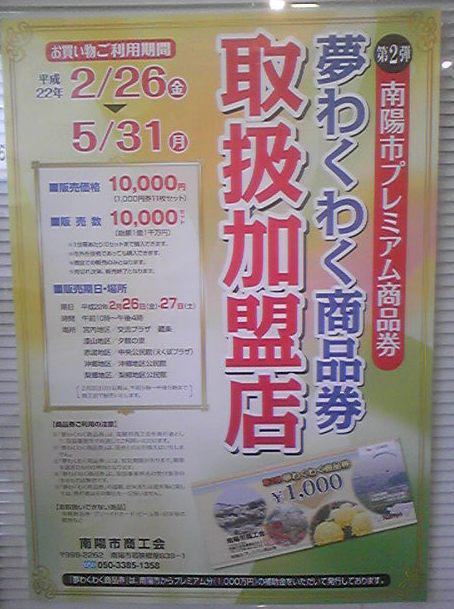 26(金)、27日(土)に発売した第2弾南陽市プレミアム商品券の『夢わくわく商品券』。10,000円で11,000円分(1,000円×11枚)使えるお得な商品券だっし。ポスターやノボリの出ている南陽市内の取扱事業所で使うことが出来ます。