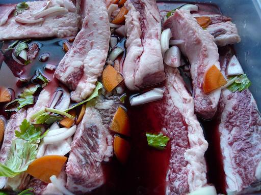 先日紹介したシチューにはもったいないばら肉。これを一晩野菜と赤ワインでマリネしています。(写真)