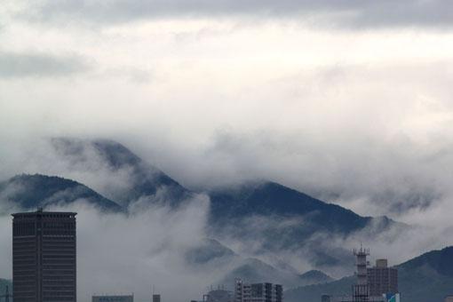 山形市内より笹谷峠方向を見ると、山から蒸気が上がり、