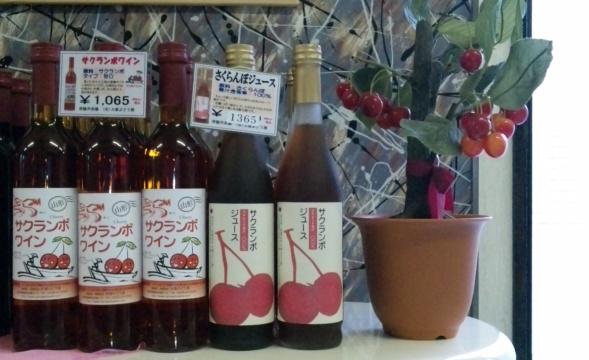 んだげんと、6月はサクランボの一番おいしい季節。おらいでも、サクランボで造ったワインとジュースがございます。今月は特にこの2種類をメインに販売したいと思います。ちなみに右側のはサクランボの飾り(模型)なので、本物ではありません(よく本物だと思っている方も多いのでご注意下さい)。