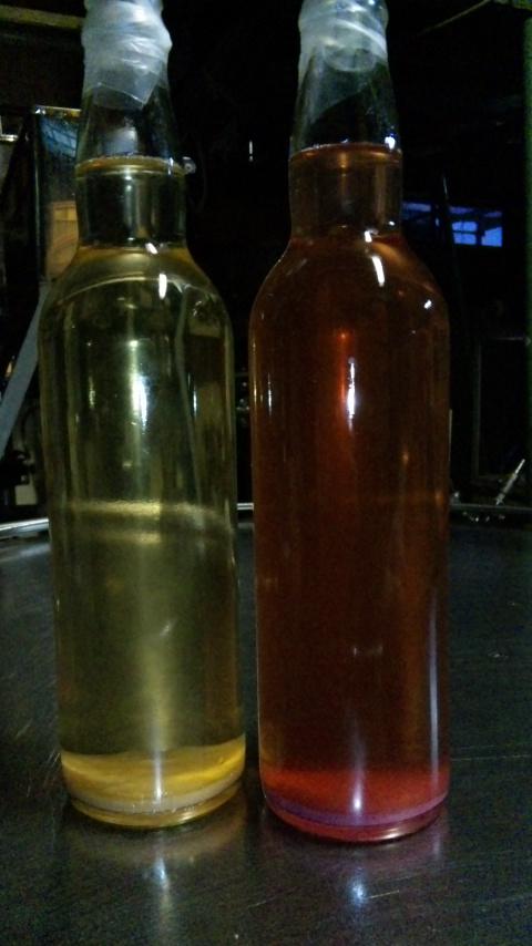 画像は明日充填予定の『アイスキャンベル』(右)と『アイスナイアガラ』(左)をタンクからサンプリングしたもの。充填前は澱下げ剤ばタンクさ入れて、澱を吸着させて沈め、一日置いて上澄み液を濾過して詰めます。