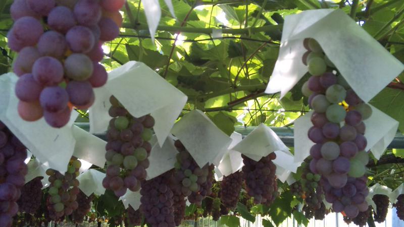 早い地区だと、もうデラウェアーは出荷しったどこあっけんど、今現在の赤湯のデラウェアー(ハウスもの)はまだ出荷前です。徐々に色がのってきてます。今の成熟期の天候が、出来の良さを左右します。
