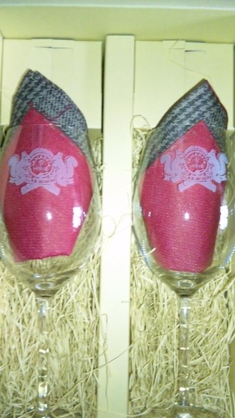毎年この時期に来られる茨城の御取引様が、ちょうど1週間前に来られ、一緒にデラウェアーのワイン仕込みを行ないました。その際にお土産で、おらいのロゴ(リスと樽のトレードマーク)の彫刻入りワイングラスを頂きました。なんとも素敵なものを頂戴し、ただただ感激です(T_T) 箱を開けてビックリしました。