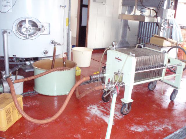 いよいよ今週から、赤ワインの仕込みを始めるので、その前にデラウェアーの仕事に一段落つけたいと思います。今日は、デラで仕込んだ『赤湯ヌーヴォー(白)』用の粗濾過作業。発酵を止め、澱引きしたので、タンクから出して粗濾過用の濾過機で濁りをとって、冷却し酒石処理を行ないます。ちなみに、充填前に仕上げ濾過と言って、粗濾過用より目の細かい小さい濾過機で最終的な濾過を行なってから瓶詰めします。