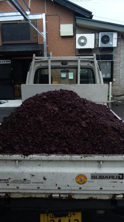 先日、取材でお越し頂いた俳優の辰巳琢郎さんと一緒に仕込んだマスカット・ベリーAが発酵中盤を迎えたので、昨日引き抜き(発酵液を違うタンクに移す)を終え、今日醪を搾りました。約5トン分を搾ったので、軽ダンプにてんこ盛り。