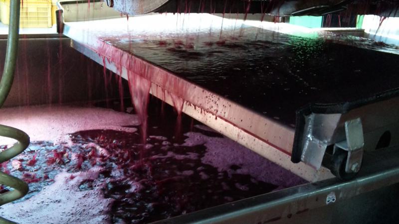 今年最後の赤ワイン用品種での圧搾を行ないました。醸し期間が終わると、発酵液部分は濾しながら別のタンクへ移動し、残った果帽(皮、種、実)部分をプレス機でギューっと搾ります。