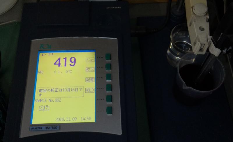 画像は今日のpH(アルカリ酸性を示す指標)をpHメーターで測ってます。普通何ぼ高くてもpH4点台まで行く事は難しいげんと、今年のカベルネは楽に4.19です。それだけ今年は、酸味が少なく凝縮されたぶどうで造っている証です。