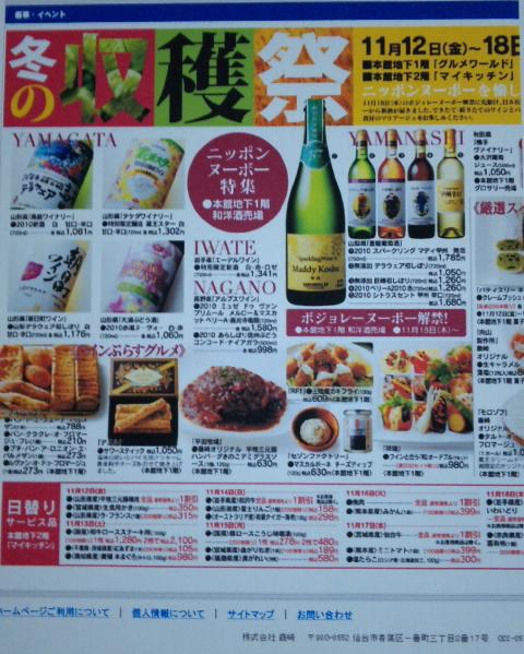 今年の7月以来2回目の藤崎デパート(仙台市)での催事です。地下一階のリカーコーナーで、日本のヌーヴォーフェアーを行ないます。おらいでも、今が旬の『赤湯ヌーヴォー2010』赤、白、ロゼをメインに、前回(7月)大好評だった『カベルネのジュース』などお持ちします。他、国産ワインコンクール銅賞受賞の『バレルエージング(ルージュ)』、珍しいデラウェアーの辛口タイプの『山形ワイン(白・辛口)』など。