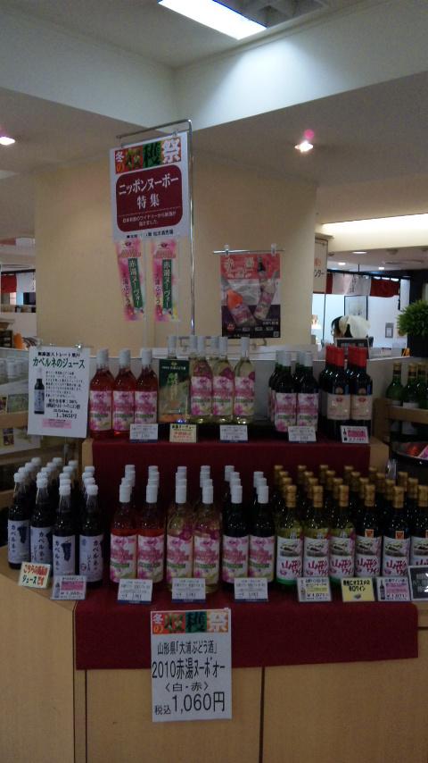 12日(金)、13日(土)と仙台の藤崎デパートにて『ニッポンヌーヴォーフェア』に出展してきました。名前の通ったワイナリーさん達と一緒の販売だったので、知名度の低いおらいは名前負けしてしまうげんと、仙台の方々にも『赤湯ヌーヴォー2010』好評でした。特に辛口の赤が一番人気。仙台は都会なので食事と一緒に優雅にワインを楽しむという方が多いので、特に赤は売れます。山形で売っと、土産的な甘口が売れっけど、地区や店のスタイルによって売れ筋は変わってきます。