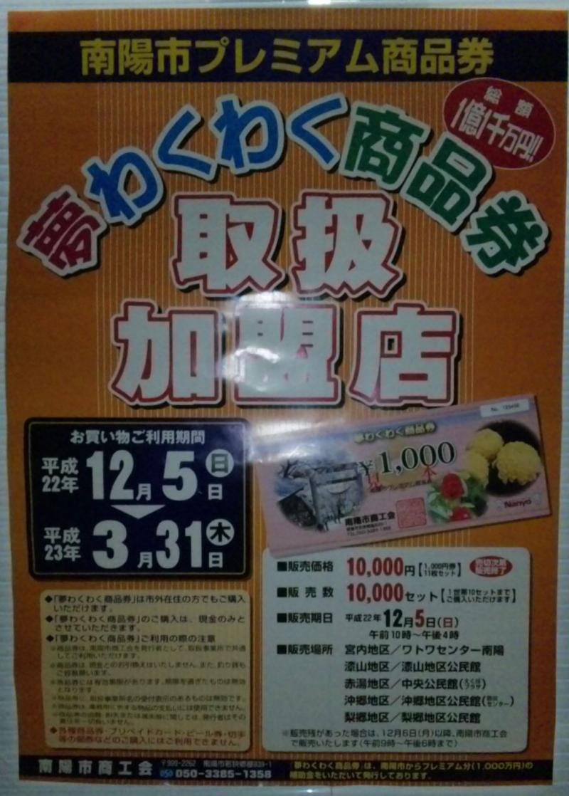 今週の日曜日12月5日に発売される南陽市プレミアム商品券。1セット10,000円で1,000円券が11枚あります。ということは、1,000円お得。おらいでも買いさ行ぐ予定。そして、おらいのワインショップでもこの南陽市プレミアム商品券がお使いいただけます(2010年12月5日〜2011年3月31日まで)。これからのお歳暮シーズンに是非どうぞっし。