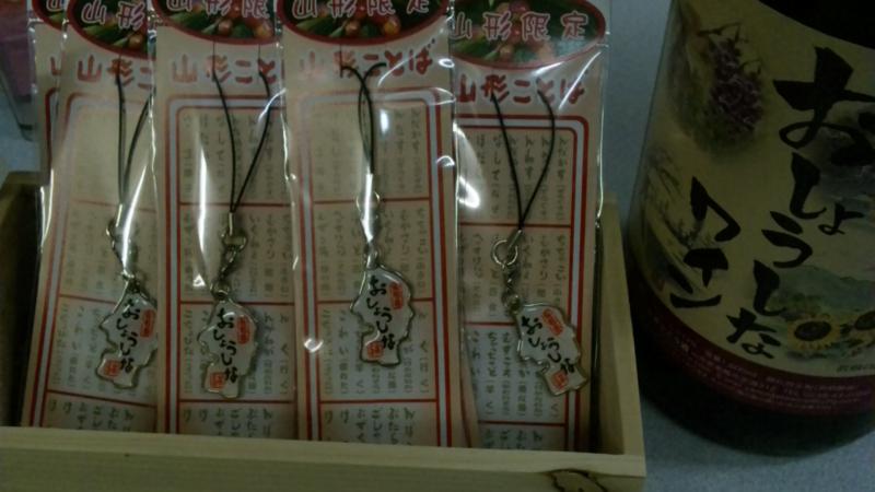 山形限定の山形ことばが書いてある携帯ストラップで『おしょうしな』を、おらいのワインショップで販売することになりました。『おしょうしなワイン』の隣りに展示してます。おしょうしなのワインとストラップ、セットで是非どうぞっし。