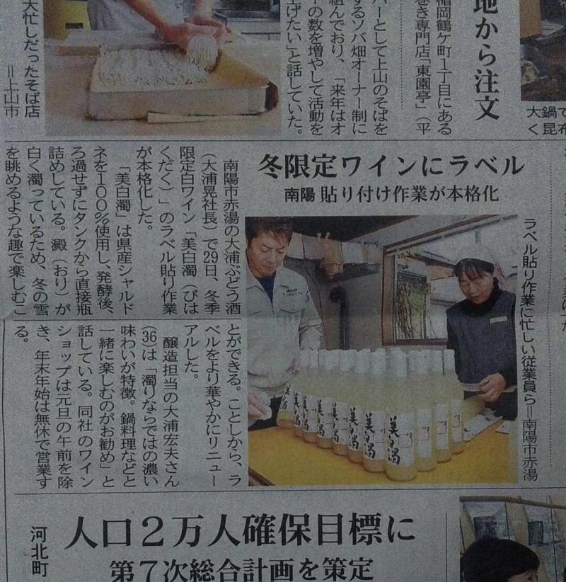 今日の山形新聞朝刊(16面)に、年末特集記事ということで、おらいの『美白濁』出荷作業を載せていただきました。お陰様でその記事を見て、美白濁を買いに来たお客様も多数してうれしかったです。お正月も雪が降るような予報なので、雪見酒として白く濁った『美白濁』を是非どうぞっし。