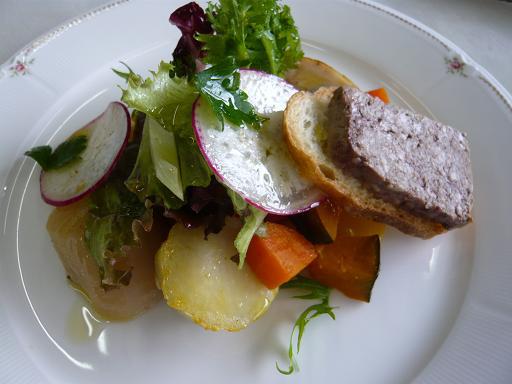 上の写真は、豚肉のパテを添えた春のサラダです。色とりどりの野菜から早春を感じていただけたらいいですね。