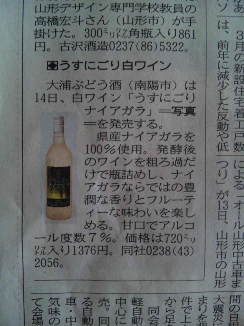 昨日の山形新聞朝刊に、『うすにごりナイアガラ』が紹介されました。新聞見て、おらさい買いに来られた方や電話でお問い合わせ頂き、どうもおしょうしなっし。
