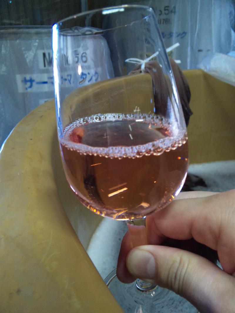 正直2009年産のはブラッシュワインにしては少々色が濃くなってしまったげんと、今回のはきれいなピンク色のブラッシュワインになりました。色と同じように桃のような甘いフルーティーな香りが強く、優しい甘さとスッキリとしたきれいな酸味がバランス良く仕上がってます。原料のマスカット・ベリーAの特長を素直に出すことを心掛けて造ったワインです。