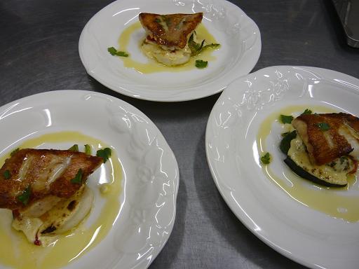 魚も同様にして焼きます。写真のガルニチュールは野菜にガーリークマヨネーズをかけてグラタンにしたものです。