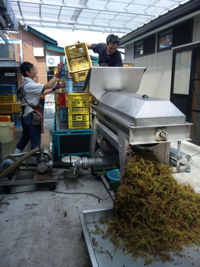 昨日は茨城の御取引様が来られて、一緒にデラウェアーでワイン仕込み。昨日は今年3回目で量も一番多く、6トンのデラを手際よく除梗破砕機さ入れて潰してプレス機で搾りました。