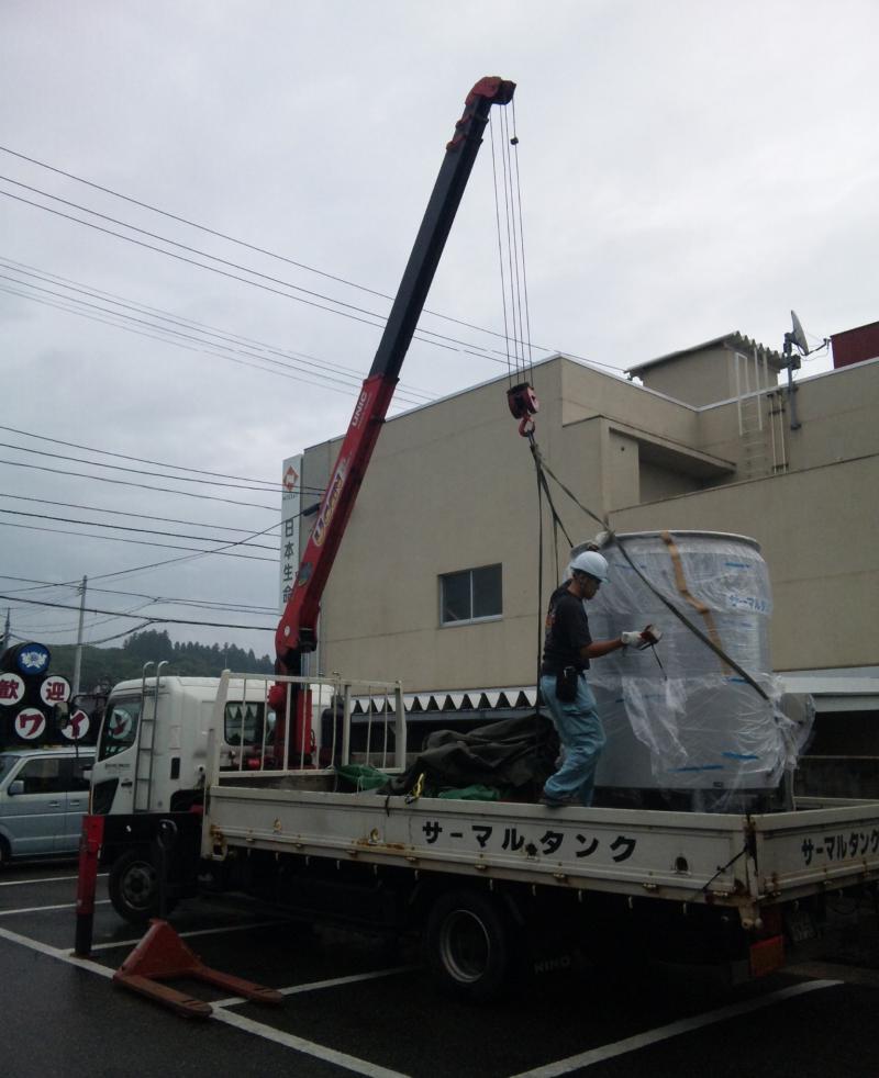 トラックからクレーンで吊って下ろして、リフトで蔵へ移動。今、仕込みが始まってるので、今日帰ってきたタンクも即戦力としてすぐに使う予定です。