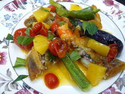 この熱々に揚った魚にオレンジソースをたっぷりとかけます。