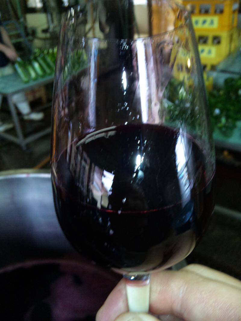 濾過中テイスティングしたげんと、原料品種であるベリー・アリカントAの濃厚な色合いと大人し目の香り、サラッとしたライトな飲み口の赤ワインに仕上がりました。18日(火)から発売します。