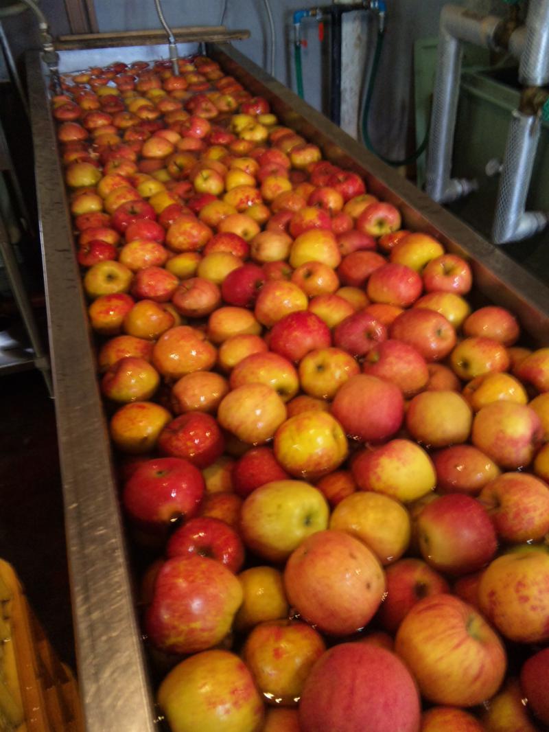 画像はリンゴを水槽に入れて洗浄と選果するところ。それから搾ります。