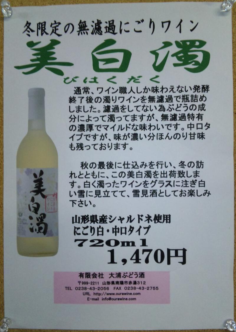 今月の7日から発売している冬限定の無濾過にごりワイン『美白濁』。販売して今年で8回目の冬を迎えます。お陰さまでリピーターも多くなりうれしいことです。発酵が終わったばかりの濁った状態のワインを無濾過で瓶詰めしてます。雪見ワインとして、今みたく雪の降る時期におすすめ。