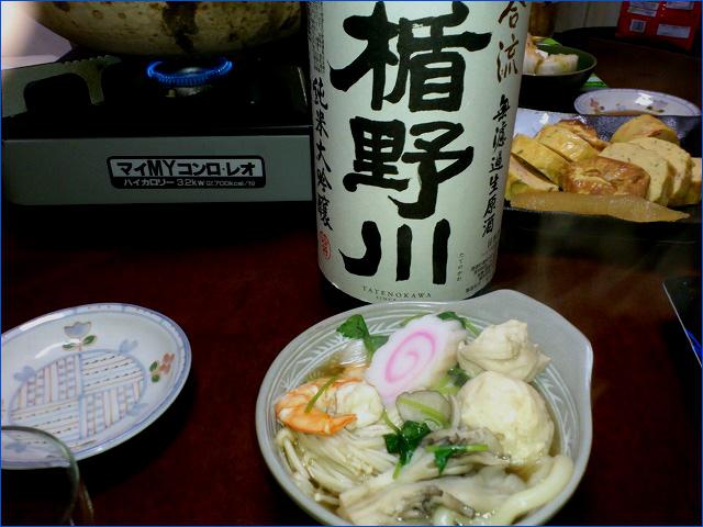 日が暮れてのお楽しみは好物のおかーちゃん特製‘うどんすき’、お酒は庄内の銘酒‘楯野川 合流’。