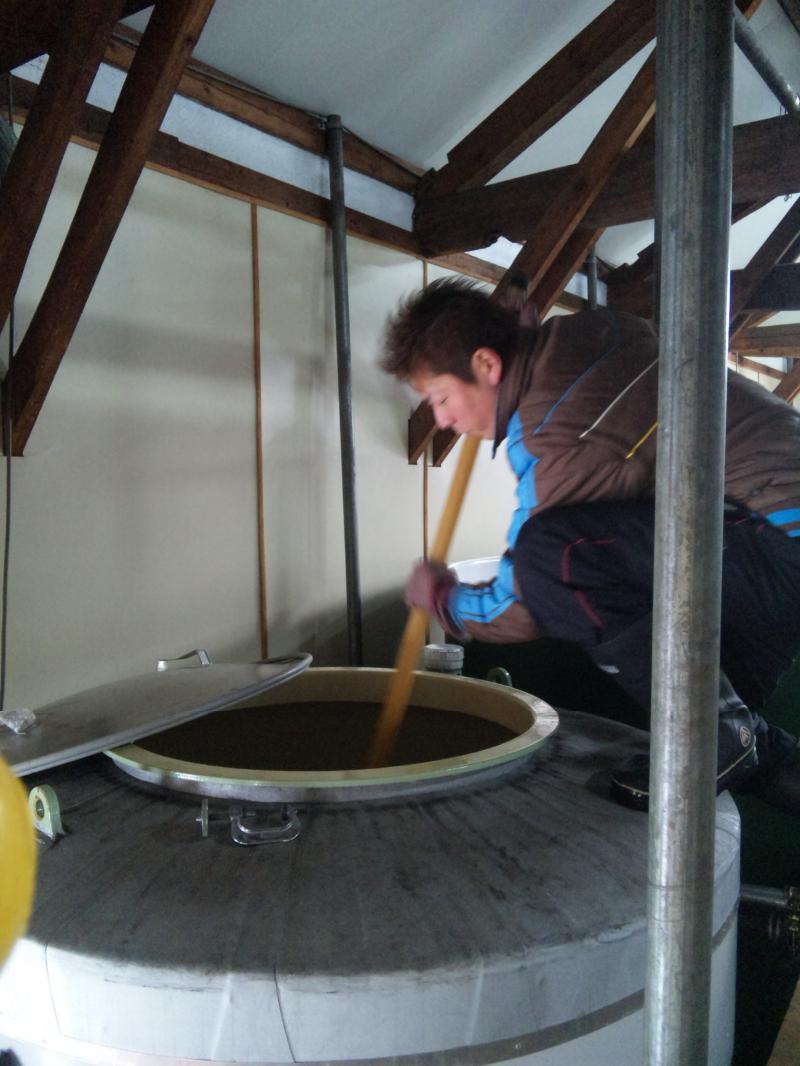 さて今日は、時々している櫂入れ作業などもしてました。2011年に仕込んだ甲州のシュール・リー製法のタンクに櫂棒を入れ、澱を攪拌させ上澄みと混ぜます。澱の持つ旨味成分を上澄みに与えているような作業です。味のあるシュール・リーにするべく、寒い冬もしっかり管理します。しかし、冬のおらいの蔵はこれまた一段と寒く、タンク内で自然に酒石処理が出来ます。