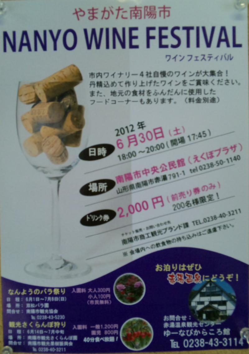 毎年夏にハイジアパークで行なっている南陽のワインフェスティバルですが、今年はもう1回すっぺ、ということになって、初夏の6月30日(土)に行なうことに決まりました。んだげんと、場所とチケット代はいつものと変わって下記の通りです。