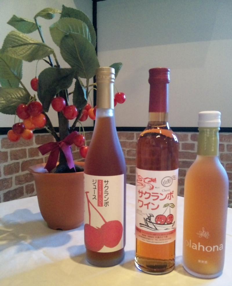 高級種佐藤錦を搾ったちょっと甘酸っぱい、ストレート100%の『サクランボジュース』。甘い風味が漂うフルーティーな甘口の『サクランボワイン』。サクランボジュースとデラウェアーのワインをブレンドした、カクテル風フルーツワイン『olahona』。