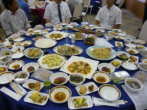 前菜からメイン、デザートまで当店も含め料理を提供した12件の皆さんからそれぞれ力作の20品ほどがテーブルに並びました。(写真)