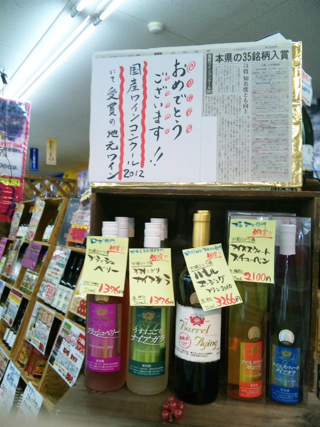 画像は、赤湯の結城酒店さんです。先日発表された『国産ワインコンクール2012』の受賞ワインのコーナーを作られていました。さすがです!