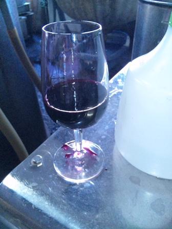 画像は濾過時のサンプリング。かんなり濃いワインです。今日瓶詰めしたげんと、品種特長であるベリー・アリカントAの色の濃厚さ、ライトな風味が楽しめる仕上がり具合だっし。出来たて特有の酸っぱい酸味のリンゴ酸を、時間をかけてマロラクティック発酵により乳酸に変え、角を取り飲み易くしております。