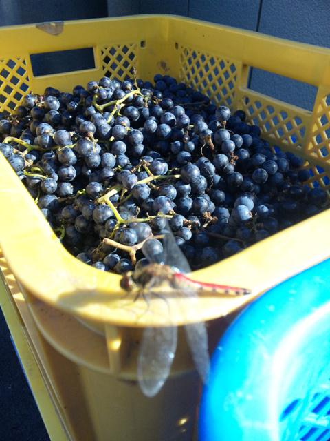 この10月はワインの仕込みと同時におらいではジュース(原液)の仕込みもしてっけど、只今山葡萄でのジュースの仕込みも盛んにしてます。酸味のレベルが他の品種より抜群に高い為、飲むとちょっと酸っぱいげんと昔から滋養飲料として重宝されてます。画像は山葡萄のコンテナに止まる赤とんぼ。いかにも秋っぽい感じがします。
