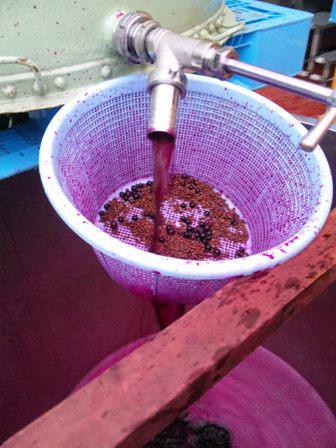 最上地区の舟形町から今年も山葡萄での委託醸造を受け、舟形町産山葡萄100%でワイン仕込みをしている最中です。発酵が進み、タンクから液だけを引き抜いて違うタンクに移しているところです。ピカピカっていう位に輝きある紫で大変健全な山葡萄らしい色合いになりました。