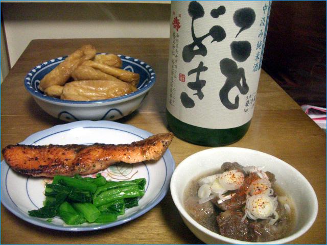 肴は全て家人のお手製、鮭のムニエルに牛筋の煮込み、それと油揚げの甘辛煮。