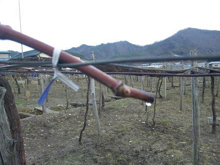 こちらはおらいの『赤湯ヌーヴォー(赤)』用の原料になっているベリー・アリカントAの苗木。残念なことに昨年1軒契約農家の方が辞めたので、先ほどのベリーAの山崎さんに植えて頂くことに。果肉がとにかく物凄く真っ赤で、赤肉と呼ばれるぶどう品種。色がかなり濃いという主張性がありながら、風味の個性は大人しくどこか控えめなぶどうです。脇役的なぶどうなので知名度的には他と比べるとちょっと低いげんと、おらいでは重宝しています。