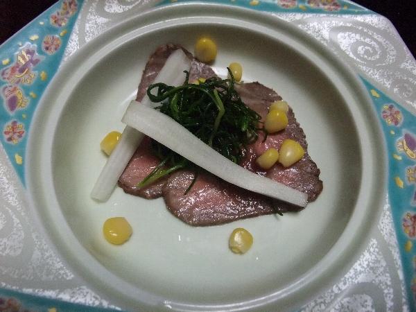 前菜「山形牛ローストビーフ、生うど、丘ひじき、