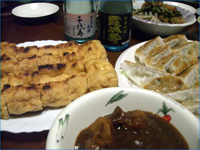 合わせたお料理(晩のおかず)、新潟は栃尾の油揚げ、味の素の餃子、牛筋のビーフシチュー。
