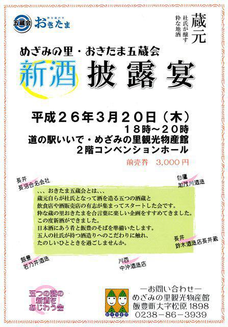 3月も半ばにさしかかろうというのに春が近いんだか遠いんだか分からない天気が続いてる今日この頃ですが、先月のおきたま五蔵会主催、「五蔵を楽しむ会in川西」も盛況に終わったのもつかの間、今月は飯豊町でおきたま五蔵会のイベントが催されます。「めざみの里・おきたま五蔵会 新酒披露宴」日時:平成26年3月20日(木) 18:00〜場所:道の駅いいで・めざみの里観光物産館2Fコンベンションホール 飯豊町大字松原1898 рO238―86―3939会費:3,000円(前売りチケット制)当日は、五蔵の新酒や自慢のお酒と地元のお料理等を楽しんでいただきます。ご興味のある方は是非ご参加ください。チケットは前売り制です。参加希望の方は当社(42−4116)までご連絡ください。