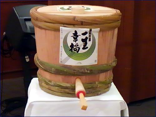 ‘ 杉の香ゆかしい樽酒で乾杯!’ 先日、長井市内のとある事業所の社長様からの「恒例の新年会で樽酒を振る舞ってお客様を持て成したい」というご依頼にお応えし一生幸福純米酒の樽酒をご用意させて頂きました。ご覧のような一斗(18リットル)用の杉樽に一生幸福純米酒を前日から詰めて頂き、会場にて呑み口を打ち込んでスタンバイOK。杉樽の凛とした立ち姿、良いですよねぇ、日本の心ここに在りといった感がございます。そして準備が整った実際の画像がこちら。 樽酒を升に並々と注いでグイッと呷れば清々しい杉の香が口中に広がってお目出度気分も増幅し、最高のサプライズかと。千波に大変美味しいお酒で好評でしたとのお褒めのお言葉を頂戴致しました。(^.^)ご用命頂いた社長様に感謝申し上げます。各種パーティに樽酒の粋な演出如何ですか。喜ばれる事享け合いですよ。^^