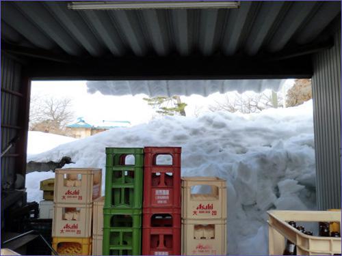 過酷な日々が嘘のように麗らかな天候が続いた2月末の数日間。当然の如く雪解けが一気に加速して行きます。(^^)/屋根の積雪が日に日に減って行くのは有難いのですが黙って見てばかりでは済まされない箇所も有りますね。我家の場合、そんな所の一つが画像の空瓶置き場がある倉庫です。ご覧のように横柱の下に覗いている物体こそ下部が氷雪と化した屋根雪の塊、放置しておけない危険物なのです。これに手を掛けないとどうなるか?それはご想像の通り、垂れ下がりの限界を超えて落下した巨大な物体が既に下に在る斜めの雪山の特性と相まって手前に在るP箱、空瓶等を跳ね飛ばすのは間違いのない所。そんな悲惨な状況を回避すべく行う作業をご紹介致します。 先ずはズームで捉えた雪山と迫出した屋根雪。横から見るとこんな感じ、奥に見えるのは總宮神社の御神木、直江杉。地上に在る雪と垂れ下がった雪の間隔が少ししか無い状況がお解り頂けるかと。実際の作業手順は先ず雪切りを縦に突き刺して切れ目を入れ、次に切れ目の根本と垂直に雪切りを突き刺しながら長方形の状態で落下させて行きます。これを何度か繰り返し一度に落下する事を回避するわけですが無難にこなすには経験に基づいたそれなりのテクニックが要求されるのは申し上げるまでもありません。最後はその建物を逆方向から見たところ。何とも凄まじい雪の量、この冬の過酷な実態がお解り頂けるかと。(^_^;)閑話休題、チョッと見、ワインかと思ってしまいそうな日本酒らしからぬラベルの純米酒が入荷しました。 沢山の猫がこっちを見ていて飲む前からホノボノとした気分になるこのお酒、カンタービレというイタリア語の品名が付いています。何でも音楽用語で「唄うように、なめらかに」という意味なんだとか。そんなイメージを酒質に表現したこのお酒、米鶴さんの意欲作です。酸が底支えした軽やかでソフトな香味は鶏のから揚げともバッチリでしたよ。(^^♪間もなく三月、春はそこまで来てますね。^^