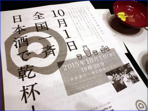 秋明菊が純白の花を咲かせ、秋本番を向かえた10月1日。第69回旬の日本酒を楽しむ会 秋の例会を「割烹ひらた」さんにて開催しました。今回は円やかに秋あがりした美酒で秋の魚介を楽しもうという趣向。そして10月1日といえば日本酒の日、この日の19時30分に合わせて全国一斉日本酒で乾杯しようという壮大な企画に我々も参加するというのが今回のもう一つのお楽しみ。特設のプロジェクターならぬノートパソコンから映し出されるメイン会場の明治記念館や姫路城、シンガポールでの乾杯前カウントダウンの模様を眺めながら全国の日本酒ファンとの連帯感にテンションが上がります。そしていよいよカウントダウン、5,4.3.2.1.乾杯!目標全国3万人に対して実際に乾杯を共有した総数は何と46,906名との事。ここ数年日本酒への関心が高まっている事が如実に示された結果ともいえるこの数字は本当に嬉しいの一言です。(^^)/ さてこの夜にセレクトしたお酒は何れも夏を越えて旨味が乗った秋あがり美酒のオンパレード。どのお酒も円やかでキレ良く割烹ひらた謹製の秋の美肴を引き立ててくれました。日本酒がご縁で知り合って日本酒の日に皆で乾杯を共有できた今回の宴。長井の酒徒の晴れやかな笑顔が印象に残った素敵な一夜でした。次回は来年2月、恒例となった立春朝搾りを楽しむ一夜を企画します。会員の皆様、次回もぜひご参加ください。今回楽しんだ‘割烹ひらた’さんのお料理の数々は以下のURLをクリックしてご覧ください。https://www.facebook.com/media/set/?set=a.769934916486616.1073741843.105832022896912&type=3
