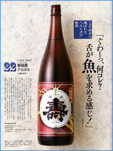 プレジデント社:【dancyu】3月号の、「魚を知り尽くした料理人が選ぶ、最高の魚酒とは?」の企画において、124本の候補酒の中から当店取扱いの「磐城壽 山廃純米酒アカガネ」が見事、第一位「ベストオブ魚酒」に輝いた。このお酒は当店から5分程度の距離に蔵を構える鈴木酒造店長井蔵が醸した山廃純米酒であるが、元々海に一番近い酒蔵といわれ福島県浪江町で地元の漁師達に愛されてきただけに山里の長井に移っても変わる事のない魚酒としての美味しさが証明されたわけである。縁あって長井の地での酒造りも早六期目となり酒質の向上著しく自信を持ってお勧めしているお蔵のお酒だけに今回の快挙は素直に嬉しく当に天晴れ。ぜひ今宵は魚料理と共に磐城壽アカガネをお楽しみください。 以下紹介文より抜粋:「絶対、焼き魚!」「いや、僕は刺身でいきたいですよ」「意外とスルメじゃないですか!?」。飲んだ途端に次々挙がる感想から、ティスター陣の静かな興奮が伝わってくる。中略、なかでも燗道具の金属「銅(アカガネ)」の名を持つこの酒は、雄町の甘みと複雑な旨味があらゆる魚の味を受け止める。奇しくも3月11日はアカガネを初めて仕込んだ日でもあったとか。かつて海とともに生きた酒は、いま海を求める酒になったのか。試飲会を終えて銘柄を明かした瞬間、会場は拍手に沸いた。