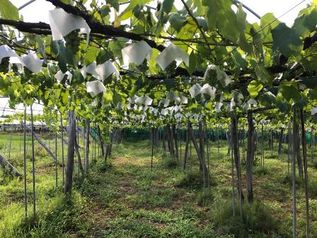 地道に傘掛けをしています。雨が降らず日差しが強いので、ぶどうの日焼けと鳥の被害を防ぎます。8月のスタートの明日も猛暑日の予報です(*_*;