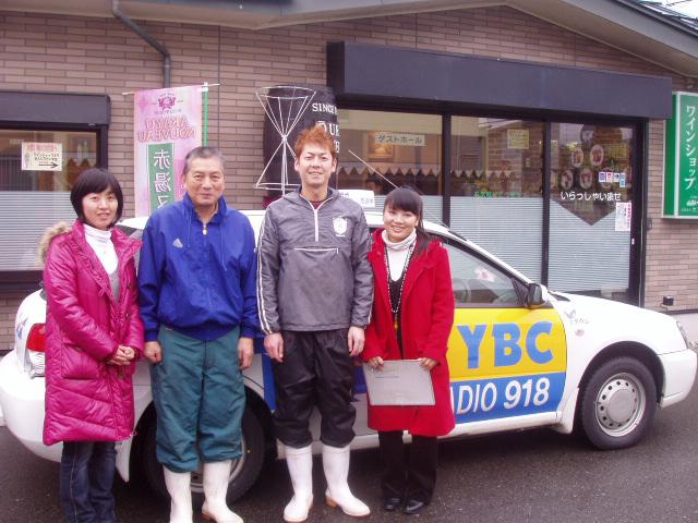 今日はYBCのラジオ番組『ハッピーロード』のラジオカーリポートに出演させて頂きました。おらいで冬限定で発売してます濁りワイン『美白濁』の取材です。生放送だっけがら緊張したぁ(*_*; 上手く伝わったべが?美人リポーターのお二人、ありがとうございました。