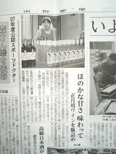 今日(12月30日)の山形新聞朝刊に師走の特集(19面)ということで、大浦ぶどう酒が紹介されてます。年末年始用のワインの記事です。冬限定で出荷している濁りワイン『美白濁』を山新さんに取り上げて頂きました。南陽支社様ありがとうございました。