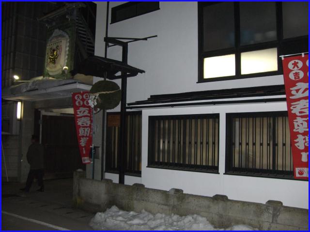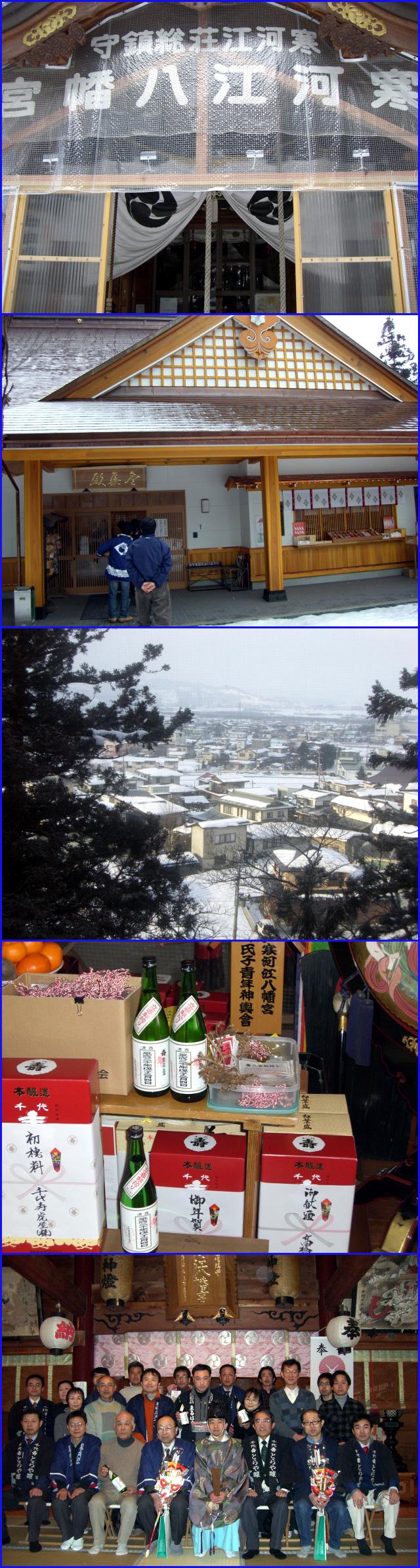 上から本殿、新築された参集殿、参集殿から望む寒河江の荘、御祓いを享け「御神酒」となった立春朝搾り、最後は御祓いの後に宮司さんを囲んでパチリ。