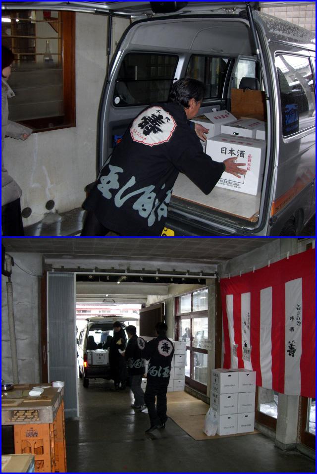 作業を終えて出荷状態が調った立春朝搾りを蔵人の方々が積み込んでくれました。