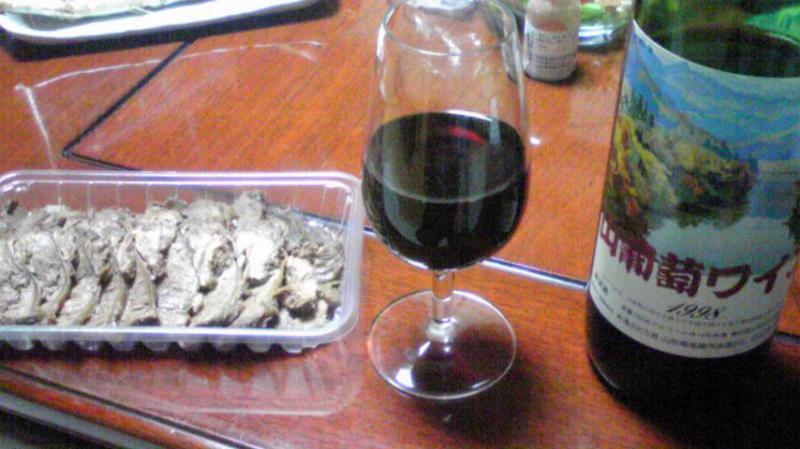 今出してるのが1998年産なので10年前に醸造したもの。山葡萄独特の野生的な味で酸味も強く、10年たってもちょうど飲み頃です。
